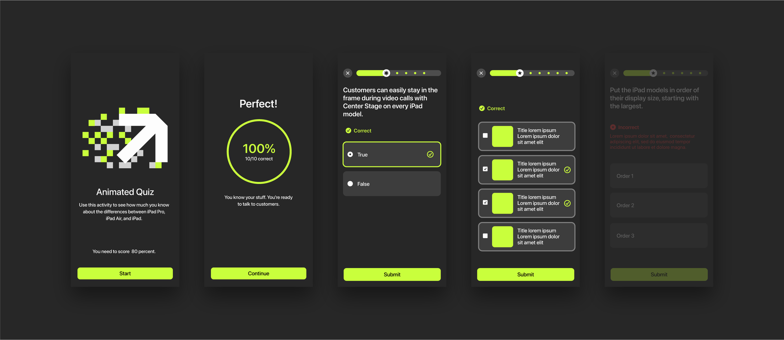 The animated quiz had to be designed for iPhone, iPad, and Desktop sized versions - so each style frame was designed with the border parameters